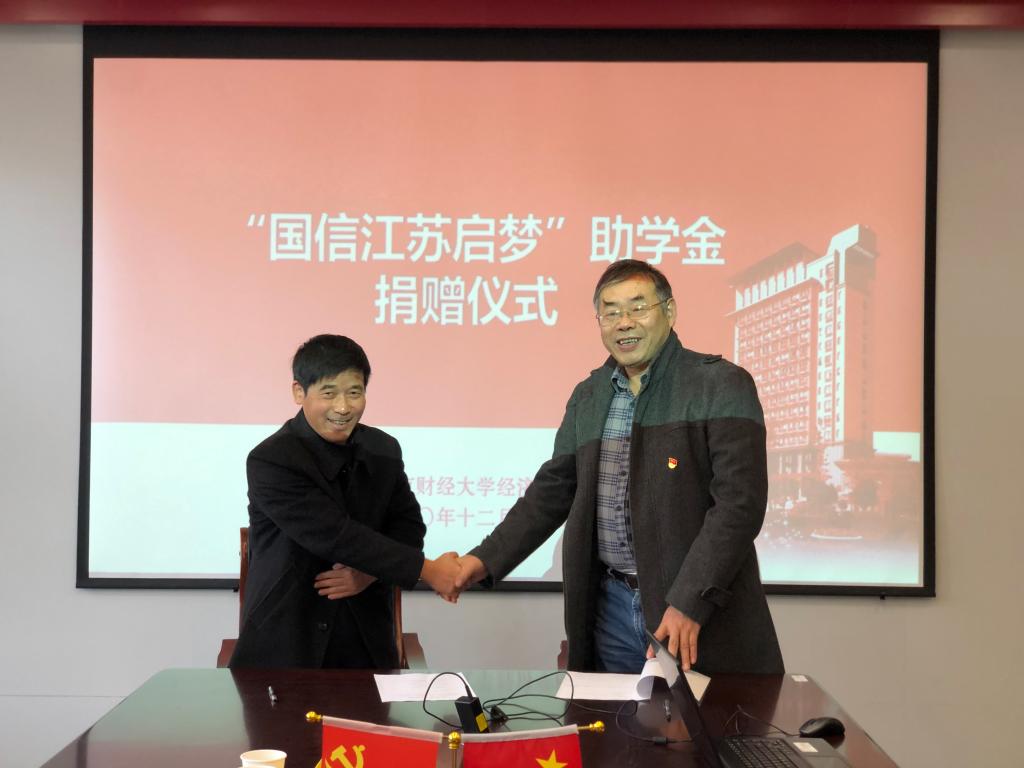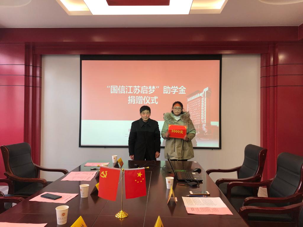 12月22日下午,经济学院在仙林校区德经楼329会议室举办“国信江苏启梦”助学金捐赠仪式。国信证券股份有限公司江苏分公司总经理祁立林一行,经济学院党委书记陈耀辉、副书记袁怡琨、学工及行政教师代表和受助学生参加了捐赠仪式。捐赠仪式由袁怡琨主持。