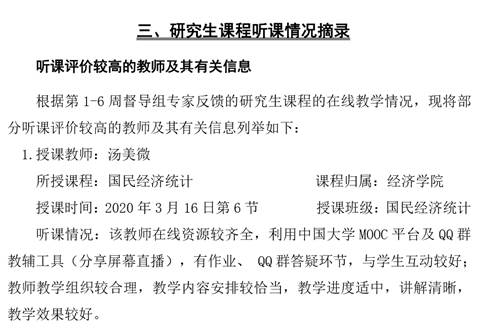 2020年4月25日,学校评估和质量监控中心发布了《开云手机web版登录入口教学督导简报》2020年第2期,我院担任研究生课程《国民经济统计》的汤美微老师被点名表扬,学校督导组认为:“该教师在线资源较齐全,利用中国大学MOOC平台及QQ群教辅工具(分享屏幕直播),有作业、QQ群答疑环节,与学生互动较好;教师教学组织较合理,教学内容安排较恰当,教学进度适中,讲解清晰,教学效果较好。”
