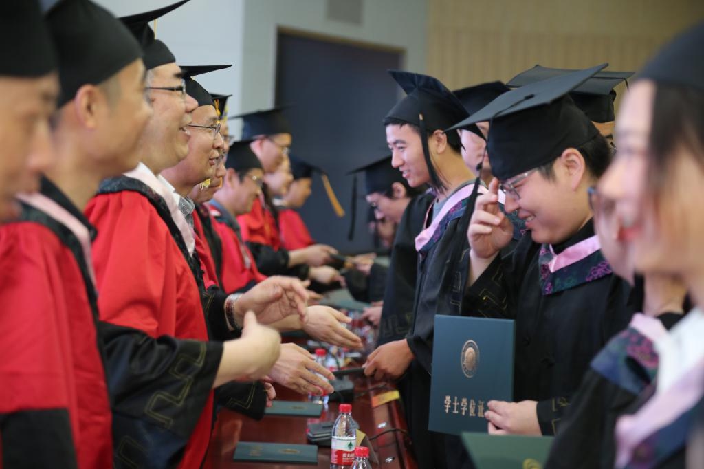 随后,副院长张成宣读了《关于授予2019届本科毕业生学士学位的决定》。在明快的音乐中,2019届毕业生们依次上台。与会领导和老师们与毕业生们热情握手,为毕业生拨正流苏、颁发硕士学位证书和学士学位证书。