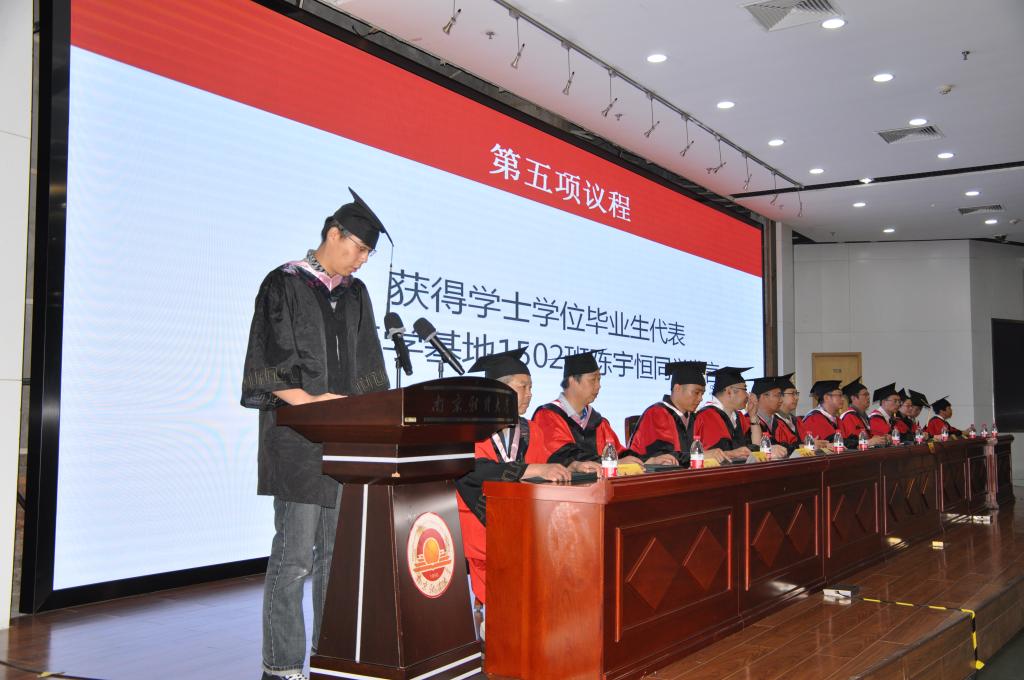 基地1502班陈宇恒同学作为毕业生代表发言。他首先向辛勤培育同学的领导与老师表示由衷的感谢,向全体毕业生表示真诚的祝福。他回顾了四年大学生活的每一瞬间,分享了四年来发生在经济学院的青春故事。在充满离别味道的六月,他在此告别南财、告别经院,与美丽校园道一声“再见”,向老师道一声“感谢”,对同学们说一声“珍重”。