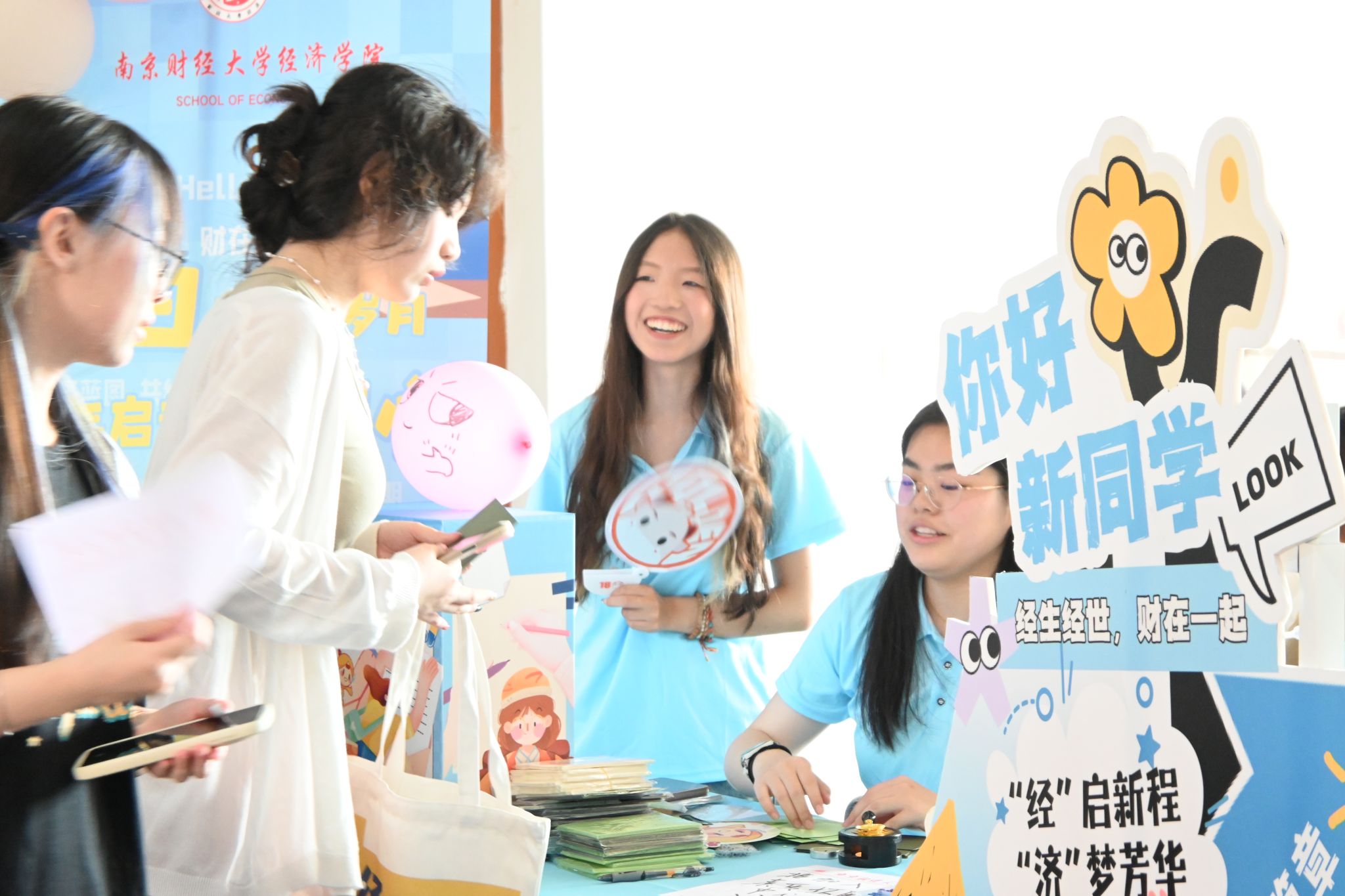 定制礼物,展现温情。为充分展现经济学院迎接新生的热情,学院还为新生准备了贴心的入学大礼包,包含精心设计的经济学院帆布袋,绘出“经”彩生活;“经济”便利贴,希望新生多多记录生活中的小确幸;“小经灵”钥匙扣以及定制徽章,展现学院的活泼姿态;独家南财明信片,体现校园靓丽风景;经院扇子,在炎热之际带来一丝清凉。这些温馨礼物拉近了学院与学生们的联系,进一步培养新生的爱校情怀。此外,学院还设置了可供打卡的笑脸墙。“新学期,新起点”,每一位新生都可以用马克笔绘制出自己心中的笑脸。342张灿烂的笑容共同组成“2025”的字样,表现出他们对大学生活的期待与喜悦,并且将始终以乐观的心态迎接大学四年磨炼与挑战。