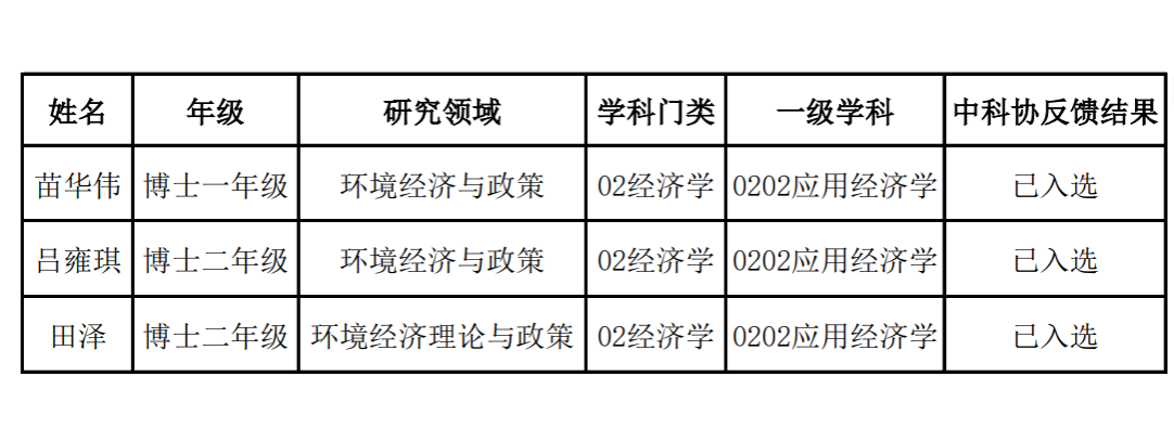 近日,中国科协公布2025年度“青年科技人才培育工程博士生专项计划”入选名单,我院应用经济学专业2025级博士研究生苗华伟、应用经济学专业2024级博士研究生吕雍琪、应用经济学专业2024级博士研究生田泽成功入选该专项计划。