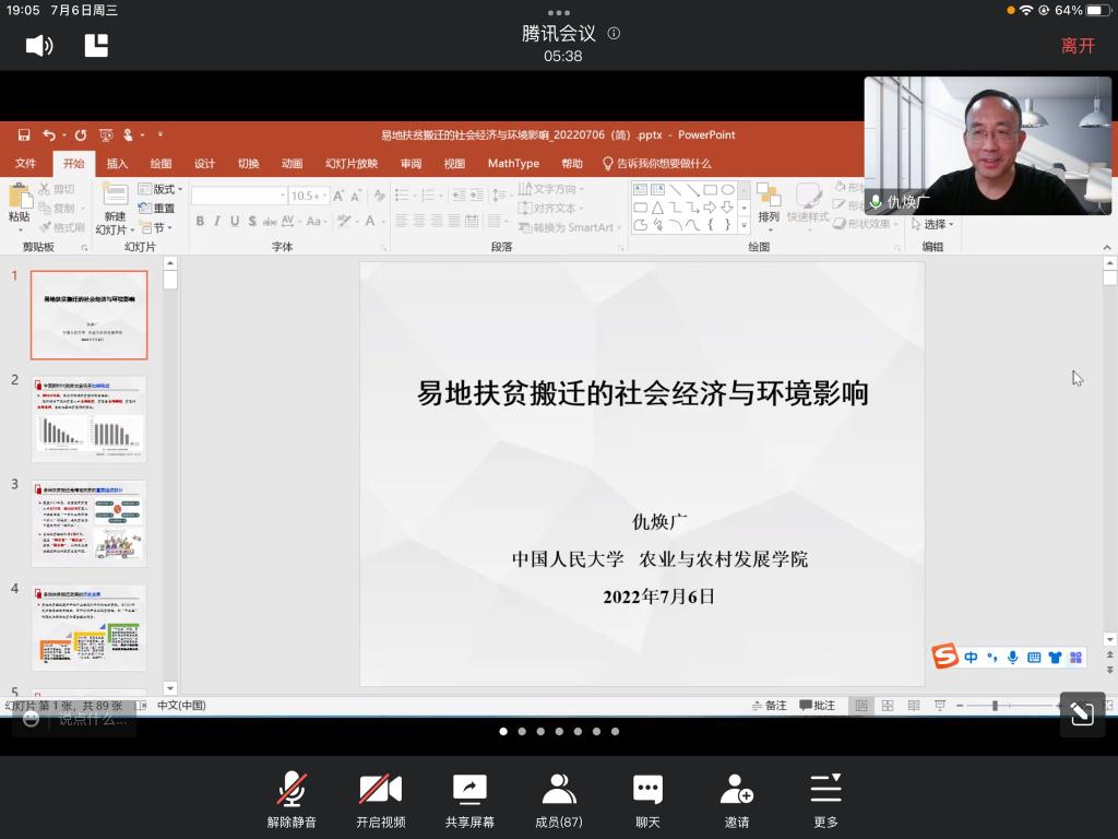 7月6日晚,中国人民大学农业与农村发展学院院长仇焕广教授应邀为经济学院师生带来题为《易地扶贫搬迁的社会经济与环境影响》的学术讲座,讲座由我院朱红根院长主持,一百多名师生在线聆听了本次讲座。